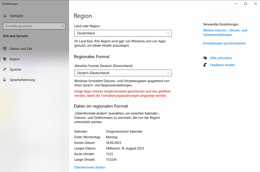 Um dies zu korrigieren, gehen Sie am jeweiligen Computer in die Regioneneinstellungen und stellen das Format zurück auf "Deutsch: Deutschland".