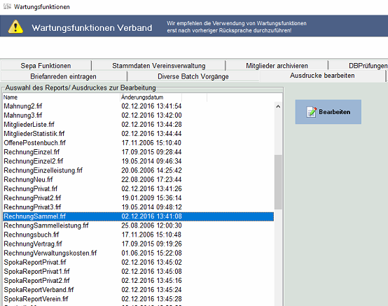 Unter den Wartungsfunktionen finden Sie ebenfalls eine Auflistung von Fastreport-Vorlagen, die sie direkt im integrierten Reportgenerator anpassen können.