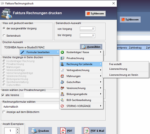 Rechte Maustaste auf die Auswahlbox des Druckers und/ oder rechte Maustaste auf die Auswahlbox des Rechnungsformulares.