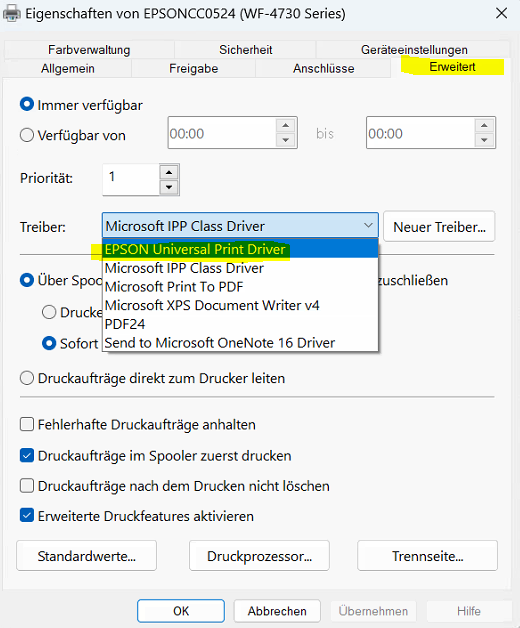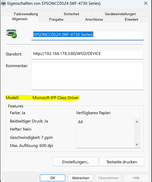 Steht dort, wie im folgenden Bild, Microsoft IPP Class Driver, müssen Sie den richtigen Herstellertreiber hinterlegen.